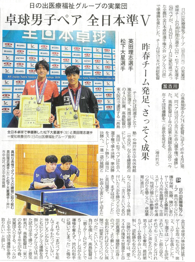 2026年3月2日(火) の神戸新聞朝刊(東播面)に、全日本卓球選手権大会(ダブルスの部)準優勝に関する記事が掲載されました。